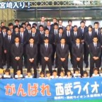 新入団選手7人の紹介があったあと、広島東洋カープ日南協力会より選手を代表して前田健太投手に、みやざき地頭鶏(じとっこ)20キロと、はまゆうポークを30キロ。日南市漁業協同組合より地どれマグロ1本。JAはまゆうより完熟キンカン30キロなどが贈呈されました。 園児の激励のあと、日南サンフレッシュレディと園児が監督・選手らに花束を贈呈。