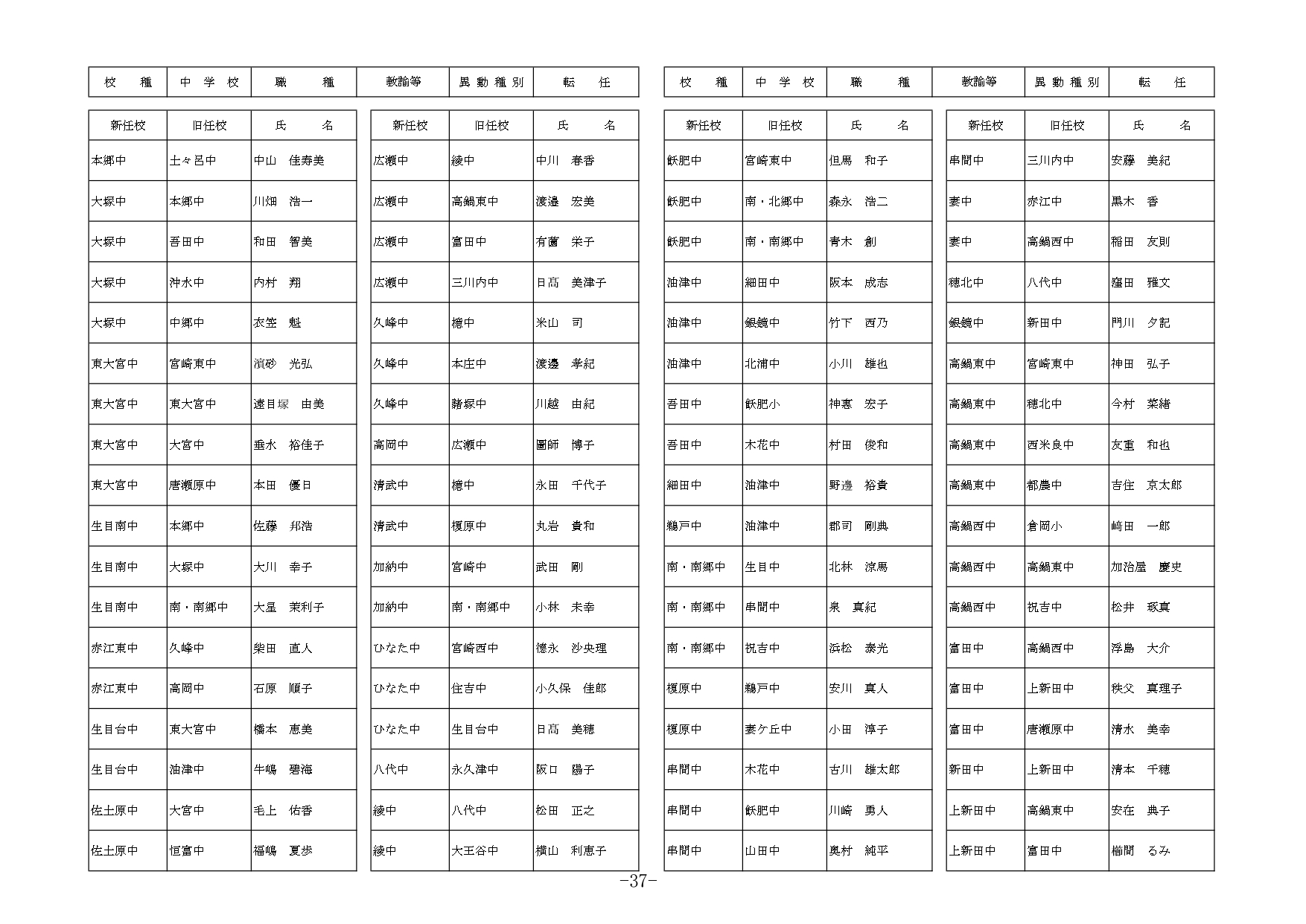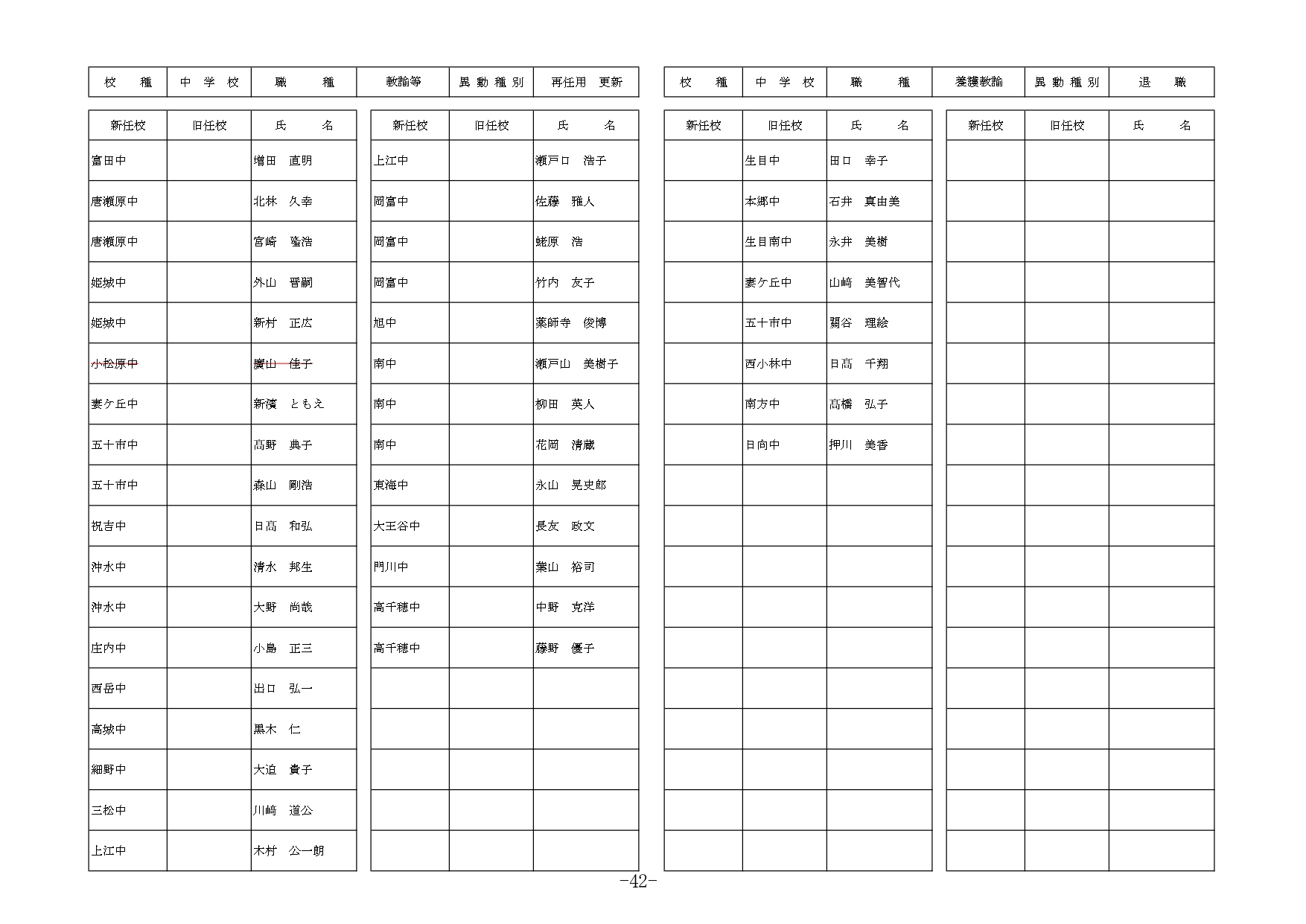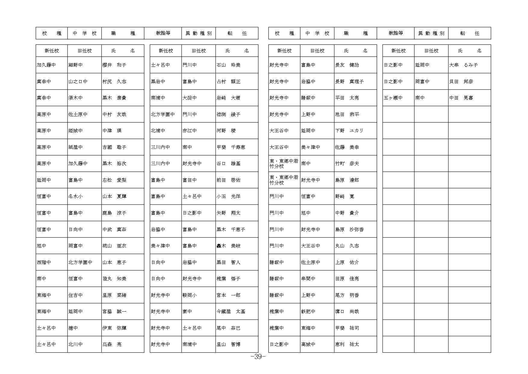 | 職種 | 異動種別 | 新所属(新任校) | 現所属(旧任校) | 氏名 |