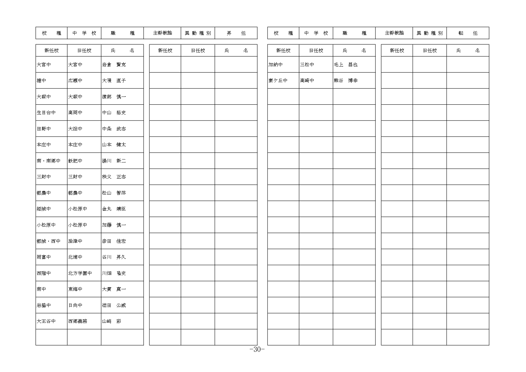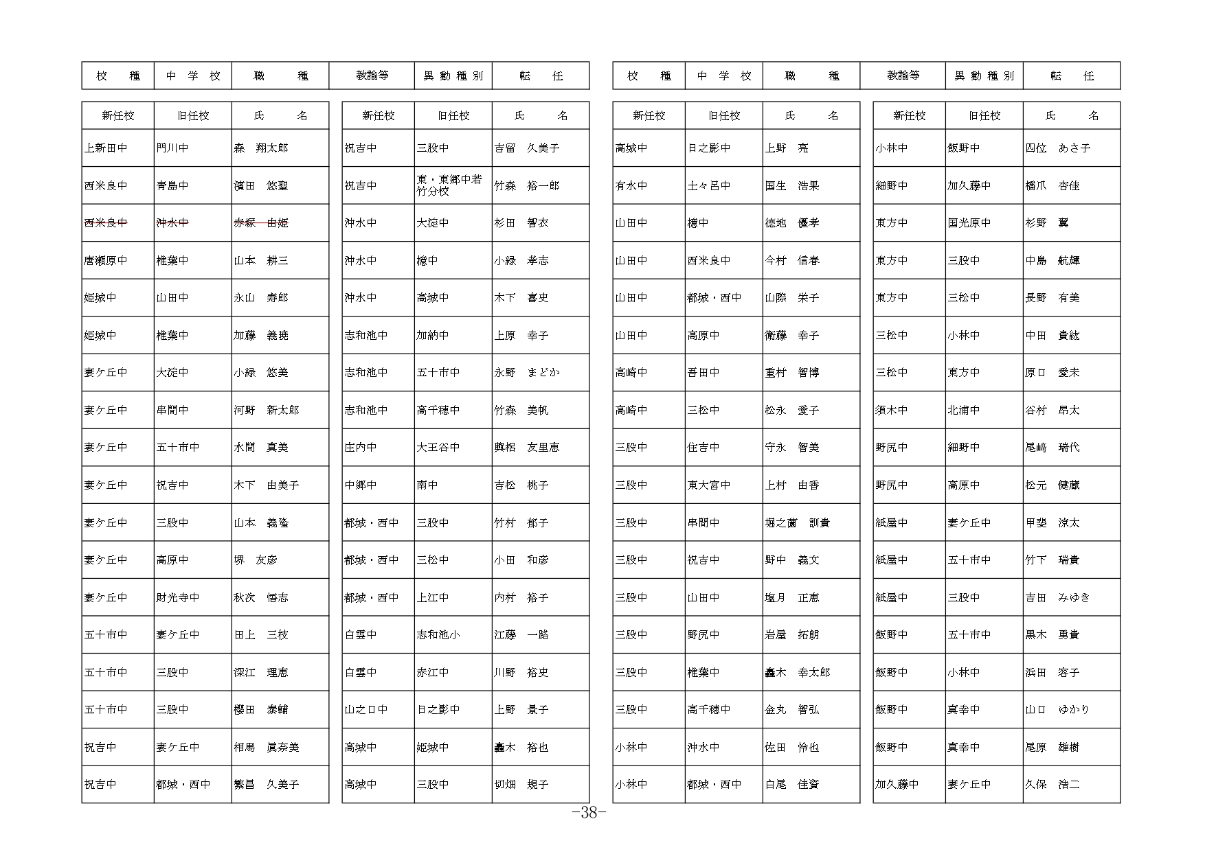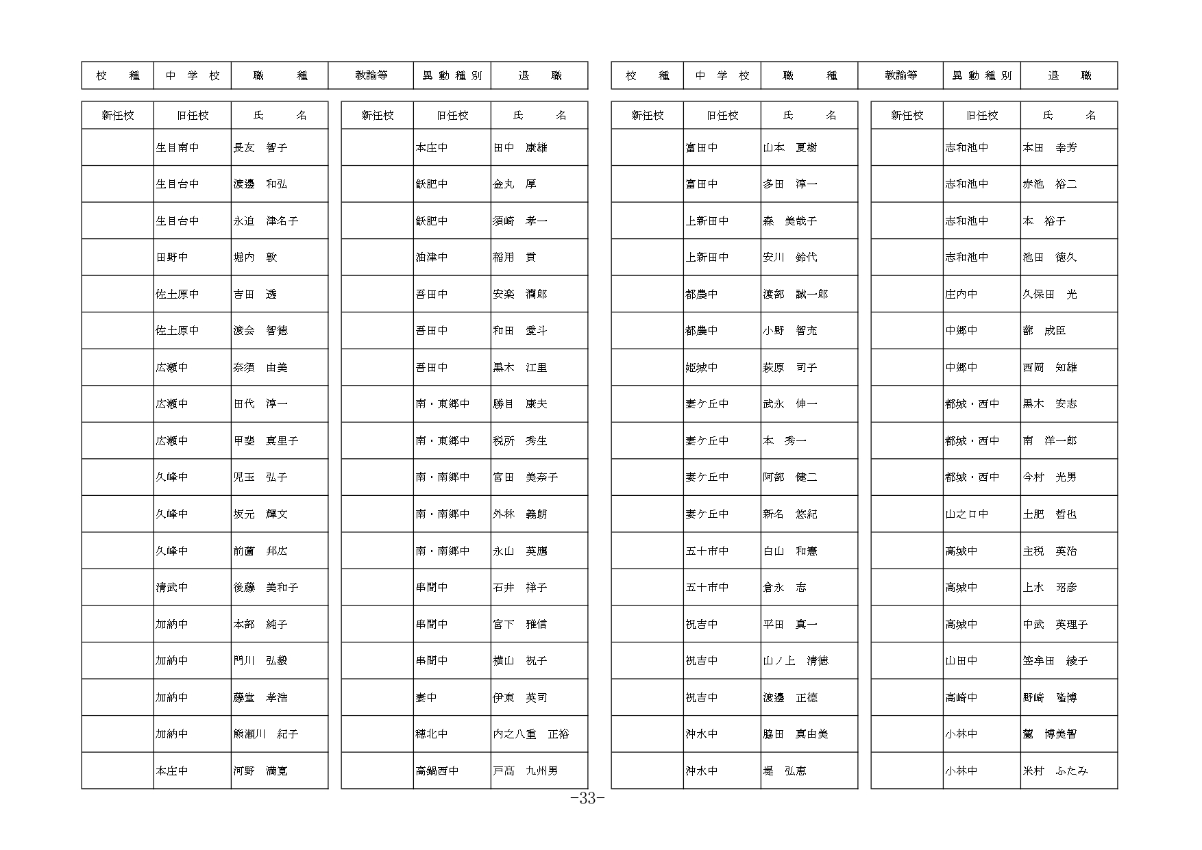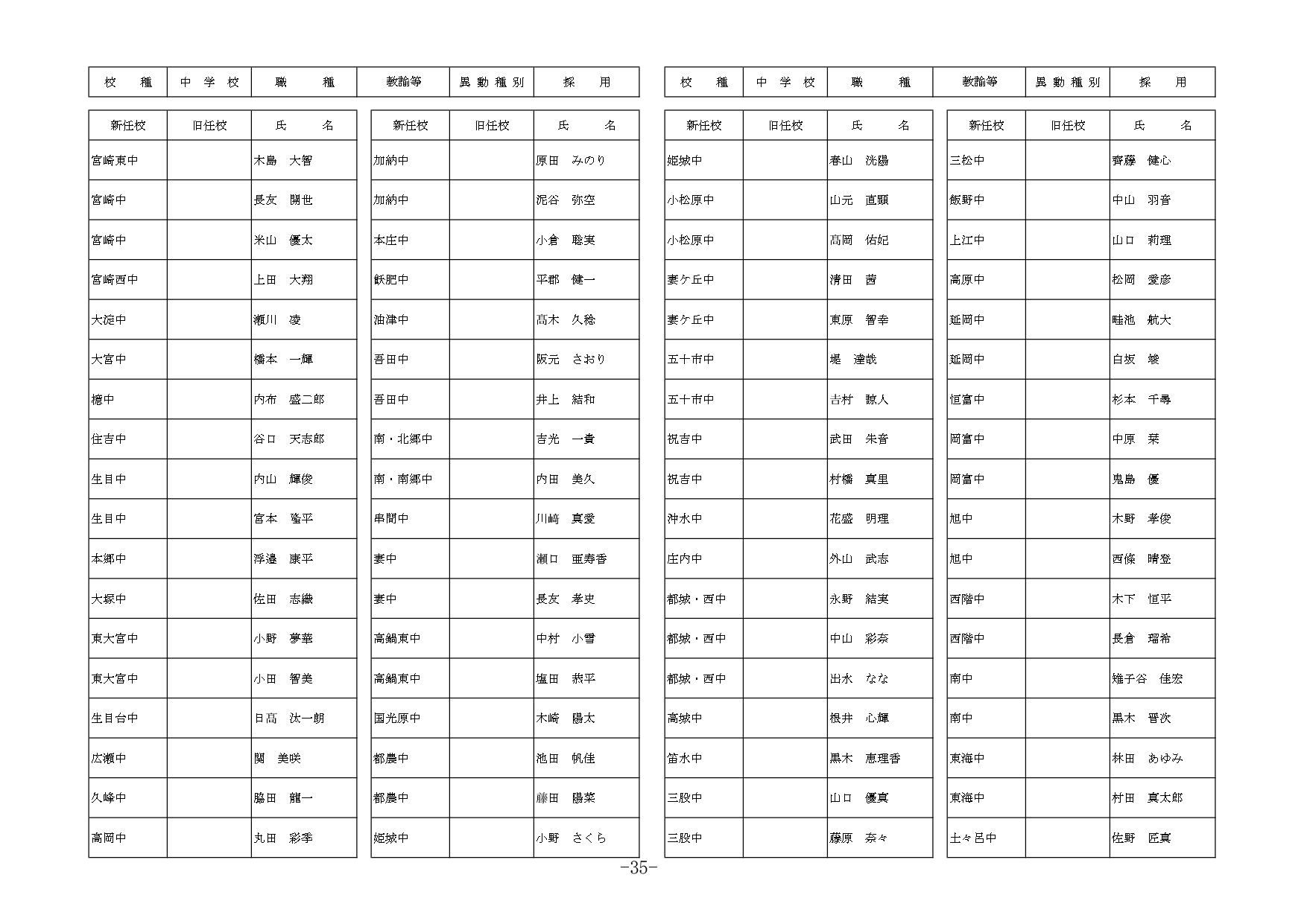 | 職種 | 異動種別 | 新所属(新任校) | 現所属(旧任校) | 氏名 |